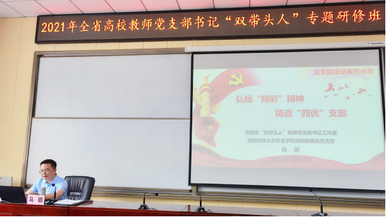 5月27日-30日,由陕西省委教育工委主办的全省高校教师党支部“双带头人”专题研修班在西安举行,来自全省高等院校的教师党支部书记代表参加了学习。我校做爱片 消防救援系党支部书记马砺为研修班做了题为“弘扬精彩精神、铸造四优党支部”-消防救援系党支部建设实践的报告,给培训班学员汇报了消防救援系党支部在创建陕西省高校“双带头人”党支部书记教师工作室的经验与成果。
