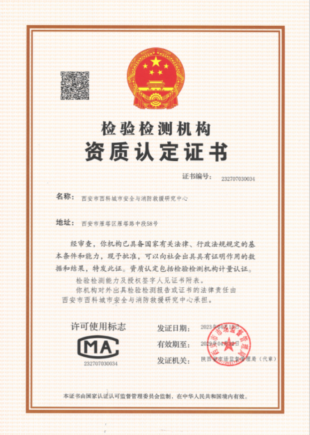 4月13日,学校获批国家检验检测机构资质认定证书(CMA)。这标志着我校成为陕西首家具有消防火灾类检验检测资质的高校,开创了学校检验检测及安全服务认证领域的新篇章,实现了教产学研高度融合的新突破,为服务国家安全、加快安全科学与工程学科建设再创新高。