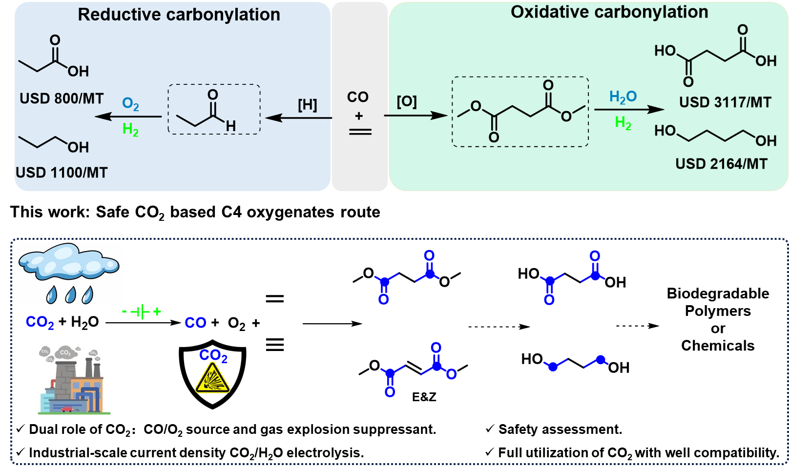 在“双碳”目标背景下,将CO2转化为高附加值化学品是实现低碳循环经济及“双碳”目标的关键路径。利用可再生电能驱动CO2电还原生成燃料或化学品是其中一条重要技术路线。然而,当前CO2电还原产物主要集中于C1或C2化合物,难以实现多碳产物、特别是单一多碳产物的高选择性制备。考虑到将CO2还原为CO的技术相对成熟,且羰基化反应能高选择性构建单一多碳产物,该团队提出将两者耦合以实现CO2的高值化利用。