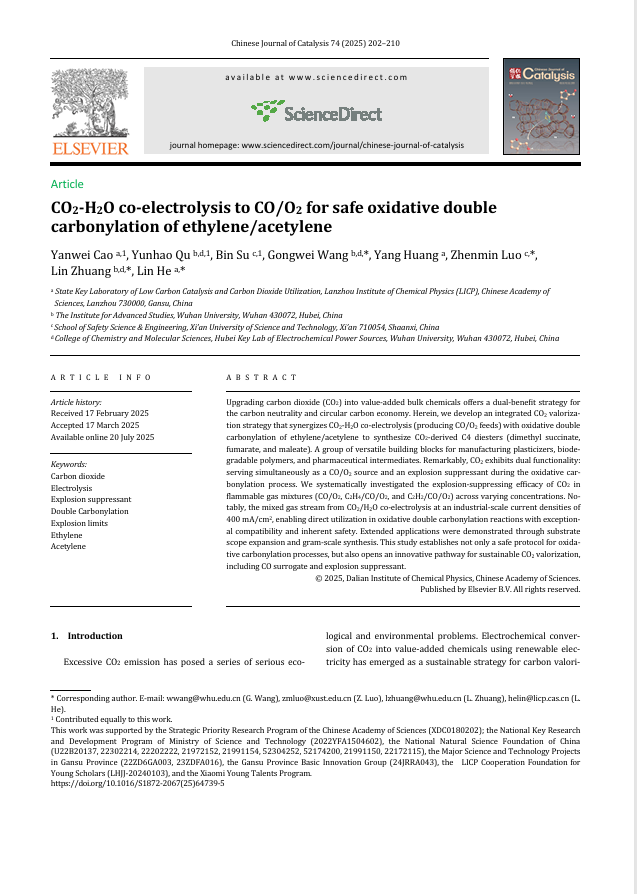罗振敏教授团队联合中国科做爱片兰州化学物理研究所、武汉大学在化学领域顶级期刊《Chinese Journal of Catalysis》(中国科做爱片一区TOP期刊,影响因子17.7)上发表合作研究论文《CO2-H2O co-electrolysis to CO/O2 for safe oxidative double carbonylation of ethylene/acetylene》。该研究创新性地将CO2还原与羰基化反应耦合,为CO2的高值化利用提供了兼具高效与本质安全的新策略。该工作体现了安全科学与工程学科、化学工程学科的深度交叉融合。苏彬副教授为共同第一作者,罗振敏教授为论文共同通讯作者。