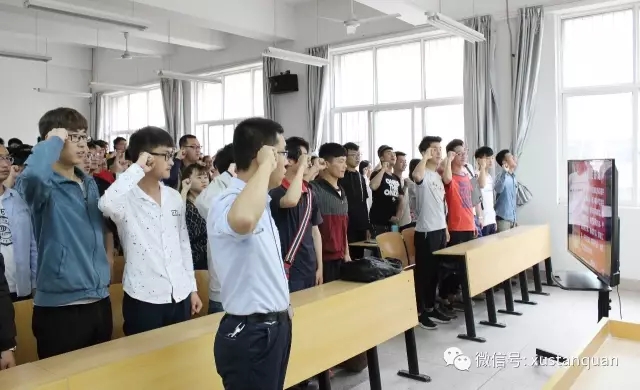 15级全体学生重温入团誓词,15级辅导员袁刚老师主持会议,和同学们一起宣誓并学习了习近平总书记到中国政法大学考察视频。