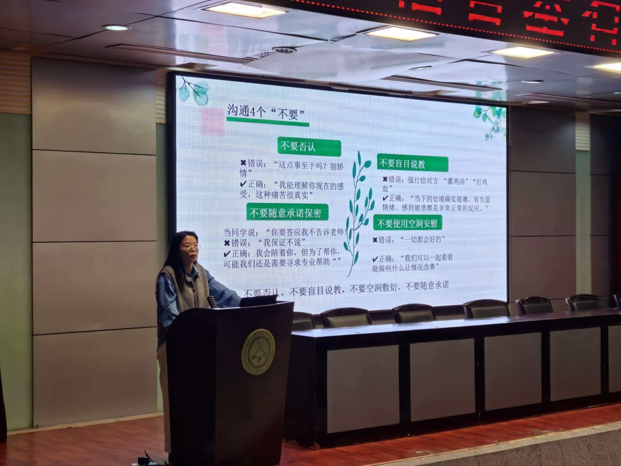 乔月月聚焦学生干部的现实需求,系统讲解了如何识别同学心理困扰信号、开展有效倾听与沟通、掌握清晰的上报与转介路径,强调了助人者的自我关怀与责任边界,并通过案例研讨与情景模拟,为同学们带来了一场温暖而深刻的大学生心理健康讲座,进一步提升了学生干部的朋辈支持能力与危机识别意识,为织密校园心理健康防护网、筑牢四级工作体系培养了基层力量。