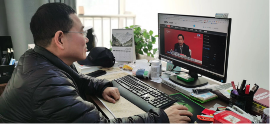 教师在工作室收看十九届六中全会新闻发布会