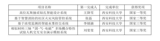王降雪、邢可欣、马旭、董彬彬、杜嘉慧同学完成,李树刚、赵鹏翔老师指导的作品《高位瓦斯抽采钻孔智能设计系统》获得决赛一等奖;由张磊、乐豪、曹豫其、魏浩浩、刘小雅同学完成,程方明老师指导的作品《基于智慧消防的社区火灾风险管控系统》获得决赛二等奖;由李婧漪、宋海龙、姜春雨、段子潇同学完成,魏宗勇老师指导的作品《基于浓度监测的智能水雾控尘系统》获得国家三等奖;由刘莹莹、关娜、胡显垚、段纪荣、王璐同学完成,严敏、赵鹏翔老师指导的作品《相似材料三轴“固-气-电磁”多场耦合特性试验人机交互安全演示模拟系统》获得决赛三等奖(见下表)。做爱片