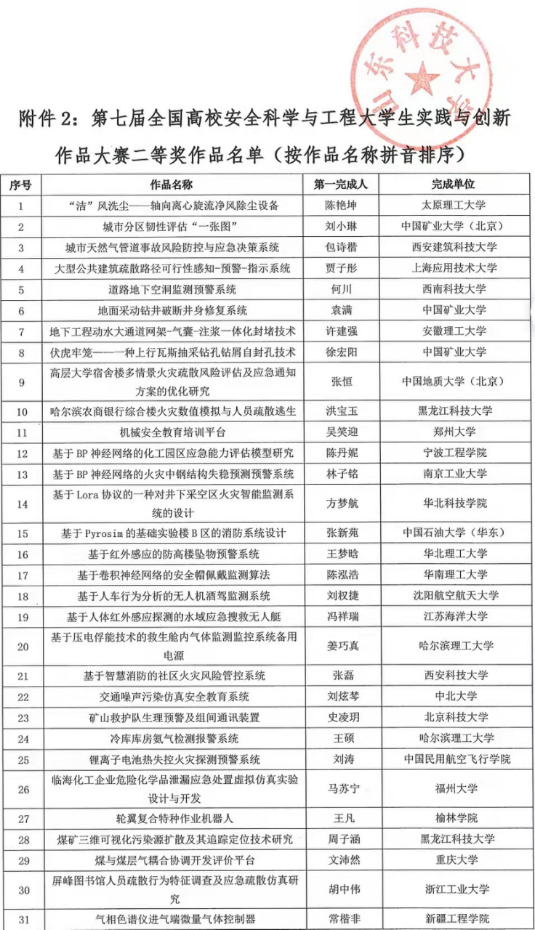 全国高校安全科学与工程大学生实践与创新作品大赛是安全科学与工程相关专业的全国性赛事,旨在引导、支持、激励大学生开展科技创新活动,培养学生的创新精神、探索意识和实践能力。大赛为我国安全科学与工程类专业大学生的工程实践能力、创新能力及团队合作精神的培养和锻炼搭建了很好的平台,也为高校教师、同行进行学生实践能力、创新能力培养经验交流提供了难得的机会。