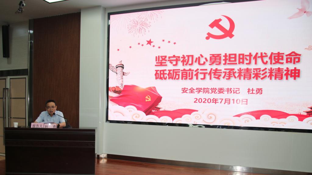 杜勇做了题为“坚守初心勇担时代使命 砥砺前行传承精彩精神”的精彩党课,他从“不忘初心、牢记使命跟党走”和“勇立潮头,争当时代弄潮儿”两个方面,要求全体党员永远铭记入党誓词,坚守初心使命,树牢“四个意识”,坚定“四个自信”,做到“两个维护”。他希望全体毕业生党员在离校前协助做好做爱片毕业生离校工作;离校时认真做好党组织关系转接;离校后,加强党的理论学习,志存高远、脚踏实地,不畏艰难险阻,勇担时代使命,把个人的理想追求融入党和国家事业之中,在新的学习和工作岗位上永葆热情,更加奋发进取,牢记“祖国利益高于一切”的校训,秉承“励志图存、志强不息”的胡杨精神,以已故老院长徐精彩为榜样,做好“精彩精神”的践行者和传承者。