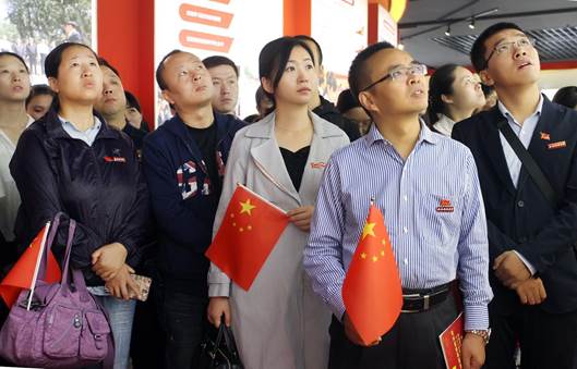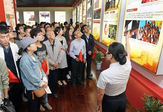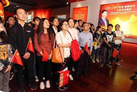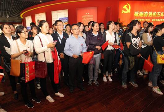 参观团到达展馆。师生们胸前统一佩戴党员徽章和校徽,人人手中挥舞着国旗,一下子为展览现场增添了许多亮点。大家边走边看,仔细聆听讲解员的讲解,还有不少同学,时不时拿出手机把自己感兴趣的图片拍照留存。
