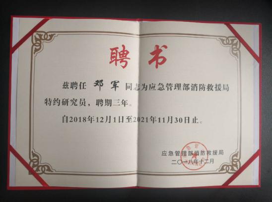 邓军教授被应急管理部消防救援局聘为特约研究员,应急管理部消防救援局副局长琼色出席并亲自为邓军教授颁发聘书。