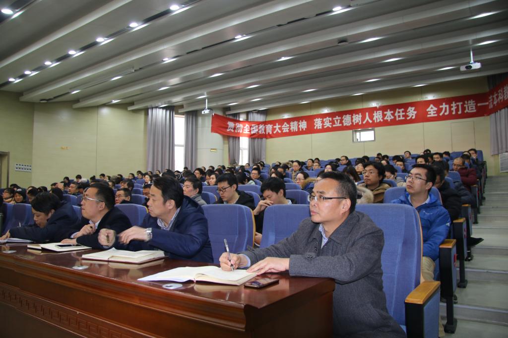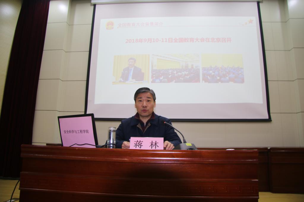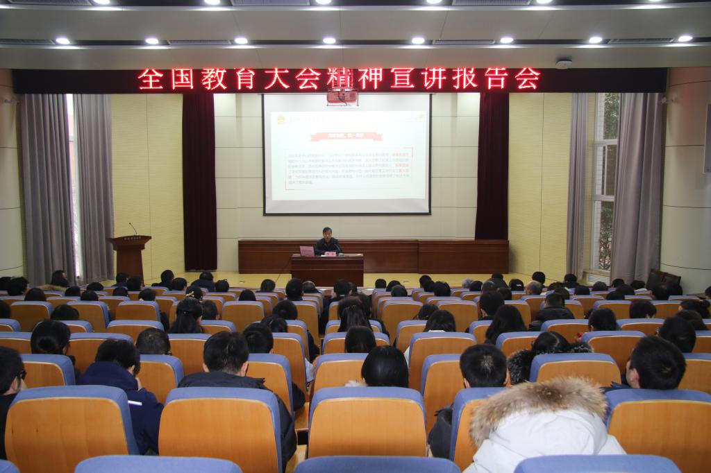 蒋林从深刻认识全国教育大会的背景与意义、全面领会习近平总书记关于教育工作的重要论述和认真落实全国教育大会精神,加强教师队伍建设三个方面就学习全国教育大会精神为广大教职工带来一场精神盛宴,对在各个岗位上为学校教育事业发展付出辛勤劳动的广大教师表示衷心感谢,同时向广大教师提出希望:希望广大教师深入学习和落实全国教育大会精神,牢记“教书育人”、“立德树人”的神圣使命,按照习近平总书记提出的“三个牢固树立”、“四个引路人”、“四个相统一”的要求,争做新时代“四有”好老师,发扬主人翁精神,秉承学校“励志图存,自强不息”的大学精神,深化做爱片