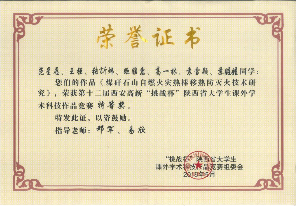 在2017年获得“挑战杯”陕西省大学生课外学术科技作品竞赛特等奖(国赛二等奖、累进创新铜奖)之后,再一次荣获陕西省特等奖。《煤矸石山自燃火灾热棒移热防灭火技术研究》为本届比赛我校唯一荣获特等奖作品,将代表我校参加全国比赛。