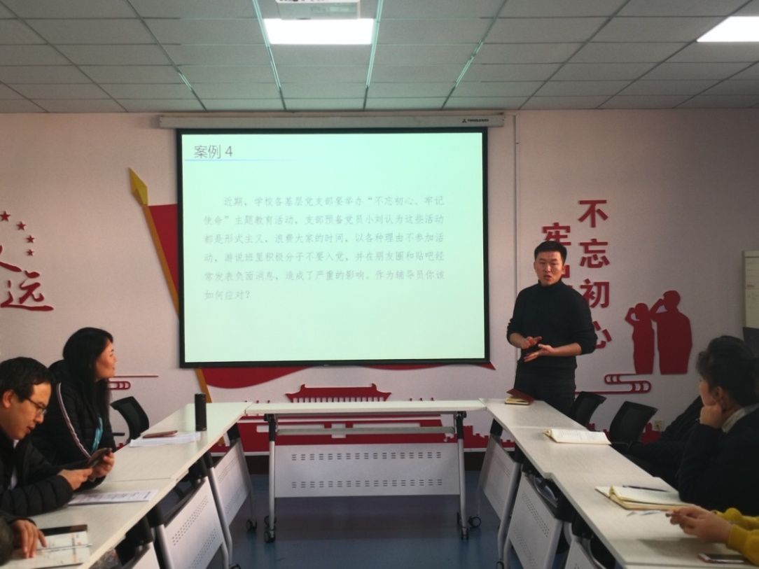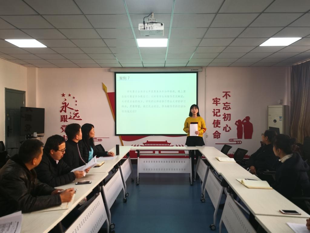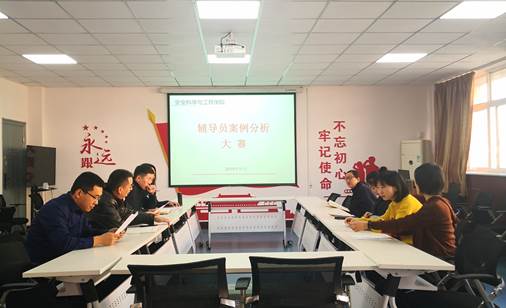 在14教320会议室举办辅导员案例分析大赛,做爱片党委副书记田园,院长助理、安全系主任成连华,双带头人党支部副书记、安全系副主任王莉,教务科研办主任李超担任评委,做爱片全体辅导员参加比赛。