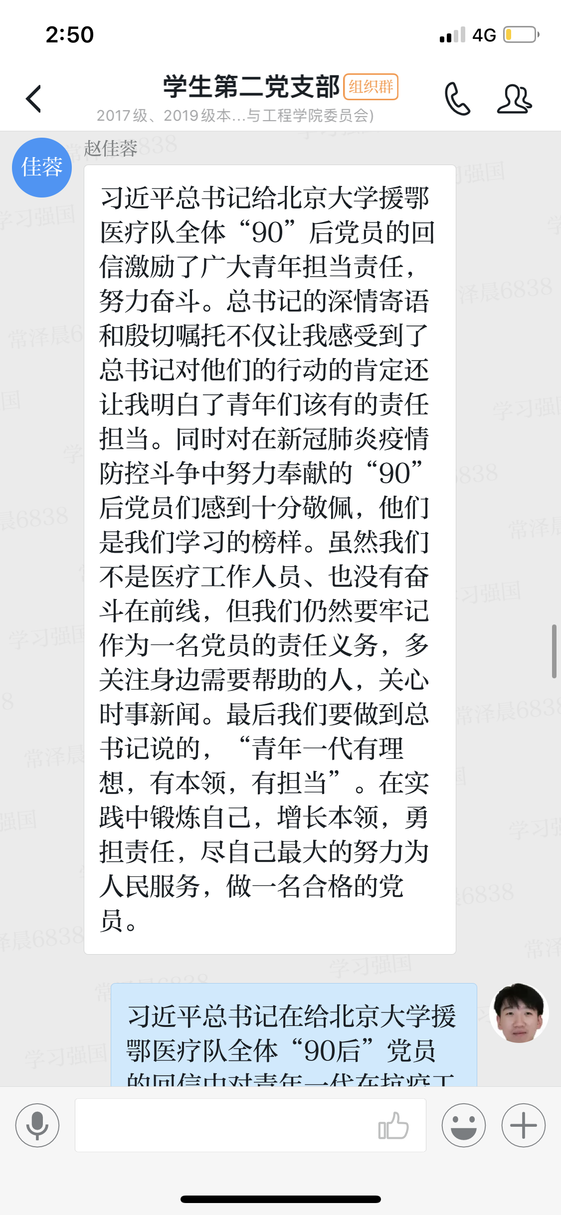 组织全体学工干部、全体学生开展“习近平总书记给北京大学援鄂医疗队全体90后党员回信”在线学习活动。师生们通过线下自学、线上集中学习,以线上主题团日活动、线上支部会、QQ群讨论、QQ群课堂主题班会导等形式完成学习,同学们结合自身实际谈了心得体会,一致认为习近平总书记的深情寄语和殷切嘱托,令人鼓舞,催人奋进,纷纷表示要为党和人民的事业作出新时代青年应有的贡献。