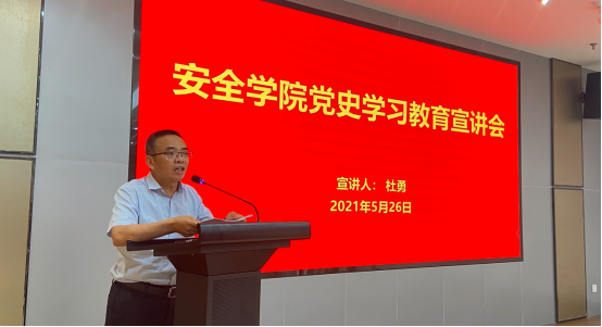 杜勇首先传达了中共中央办公厅印发《关于在全社会开展党史、新中国史、改革开放史、社会主义发展史宣传教育的通知》精神。随后,他紧紧围绕《党史学习教育宣讲提纲》,从深入学习领会习近平总书记关于党的历史的重要论述,充分认识开展党史学习教育的重大意义;认真研读党史基本著作,全面了解中国共产党百年奋斗的光辉历程和历史性贡献;深刻把握开展党史学习教育的重点;开展党史学习教育,要学懂弄通做实习近平新时代中国特色社会主义思想,增强“四个意识”、坚定“四个自信”、做到“两个维护”等四个方面原汁原味进行了宣讲。