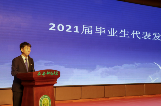 毕业典礼在庄严的国歌声中拉开序幕,2021届毕业生代表常泽晨、在校生代表2018级学生翟芳妍、毕业班辅导员郭胜忠进行了发言。