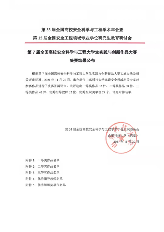 全国高校安全科学与工程大学生实践与创新作品大赛是安全科学与工程相关专业的全国性赛事,旨在引导、支持、激励大学生开展科技创新活动,培养学生的创新精神、探索意识和实践能力。大赛为我国安全科学与工程类专业大学生的工程实践能力、创新能力及团队合作精神的培养和锻炼搭建了很好的平台,也为高校教师、同行进行学生实践能力、创新能力培养经验交流提供了难得的机会。