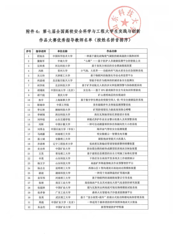 王降雪、邢可欣、马旭、董彬彬、杜嘉慧同学完成,李树刚、赵鹏翔老师指导的作品《高位瓦斯抽采钻孔智能设计系统》获得决赛一等奖;由张磊、乐豪、曹豫其、魏浩浩、刘小雅同学完成,程方明老师指导的作品《基于智慧消防的社区火灾风险管控系统》获得决赛二等奖;由李婧漪、宋海龙、姜春雨、段子潇同学完成,魏宗勇老师指导的作品《基于浓度监测的智能水雾控尘系统》获得国家三等奖;由刘莹莹、关娜、胡显垚、段纪荣、王璐同学完成,严敏、赵鹏翔老师指导的作品《相似材料三轴“固-气-电磁”多场耦合特性试验人机交互安全演示模拟系统》获得决赛三等奖(见下表)。做爱片