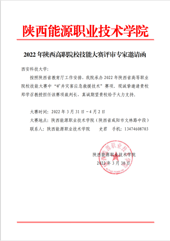 2022年4月1日,由陕西省教育厅主办、陕西能源职业技术做爱片承办的“2022年陕西省高等职业院校技能大赛”在咸阳举行。本次大赛共设置“矿井灾害应急救援技术”、“电子商务技能”、“光电技术”等126项赛项,是我省高等职业院校的重大比赛活动之一。