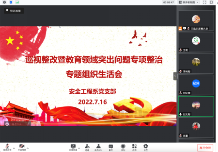党委书记刘文刚点评,安全工程系党支部全体党员参加会议。会议由安全工程系党支部副书记王凯主持。